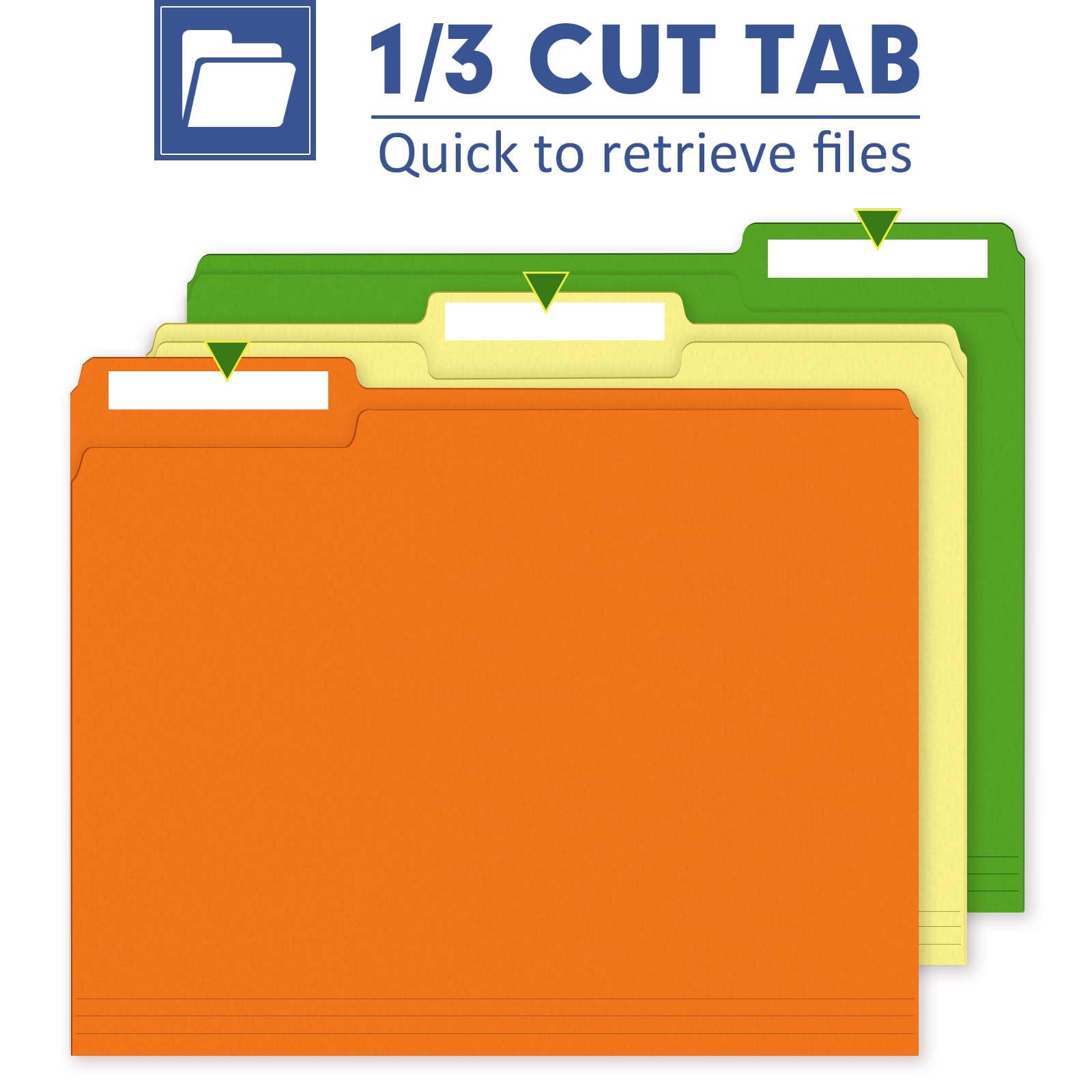 - Trisection Cut Tab - Each file folder features a 1/3 cut tab, allowing for easy labeling and quick identification of contents. Pencil or erasable pen can be used to write marks